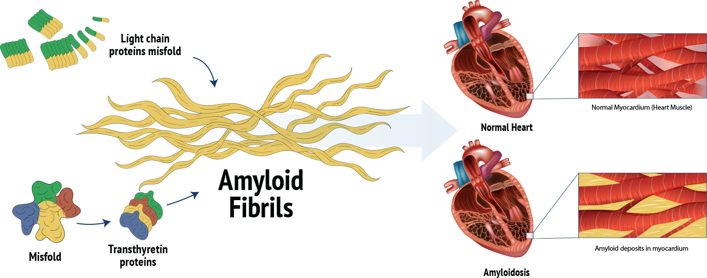 Amyloidosis is a disorder caused by misfolding of intrinsic body proteins. These misfolded proteins are insoluble and are termed 'amyloid proteins'. Amyloid proteins can deposit in various body organs, resulting in organ dysfunction. When these amyloid proteins deposit in the heart, it causes heart dysfunction, term 'amyloid cardiomyopathy' or 'cardiac amyloidosis'.
